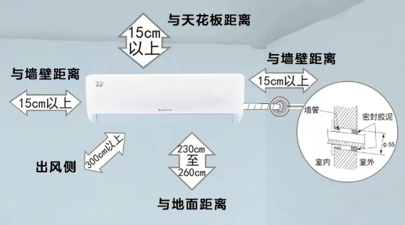 空調內機回風口與室外空間的距離決定了運行效果?;仫L距離過近會導致回風量不足,制冷效果差。內機與天花板距離宜在15cm以上,距離墻壁12cm以上,距離地面230-260cm最佳。確保進出口暢通無阻,讓送風無障礙!